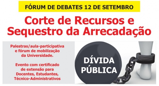 A Auditoria Cidadã da Dívida em conjunto com a UNB Planaltina organiza o "Fórum de Debates sobre Corte de Recursos e Sequestro da Arrecadação", que acontecerá em 12 de setembro, de 9h30 às 12h30, no auditório do Instituto de Ciências Sociais da Universidade de Brasília (ICS/UnB).