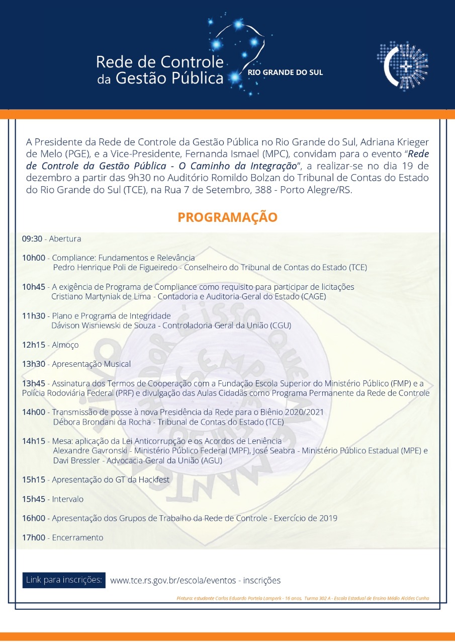 A Rede de Controle é um grupo de trabalho formado em 2009 no Estado e conta com a participação de 28 órgãos participantes do meio jurídico estadual e federal, como PGE, MP, TCE, além das universidades PUCRS, Uergs e Ufrgs (convênio em andamento) e a Fundação Escola Superior do Ministério Público. Como explica a atual presidente, Adriana Krieger de Melo, procuradora do Estado, a Rede tem o papel de fiscalizar a gestão pública, o diagnóstico e combate à corrupção, o fortalecimento e incentivo do controle social, o compartilhamento de informações e documentos, a troca de experiências e a capacitação de seus meios. “A Rede é um grande fórum onde conseguimos discutir e viabilizar a atuação destes órgãos, fazendo com que o trabalho avance, já que individualmente é muito difícil”, observa.