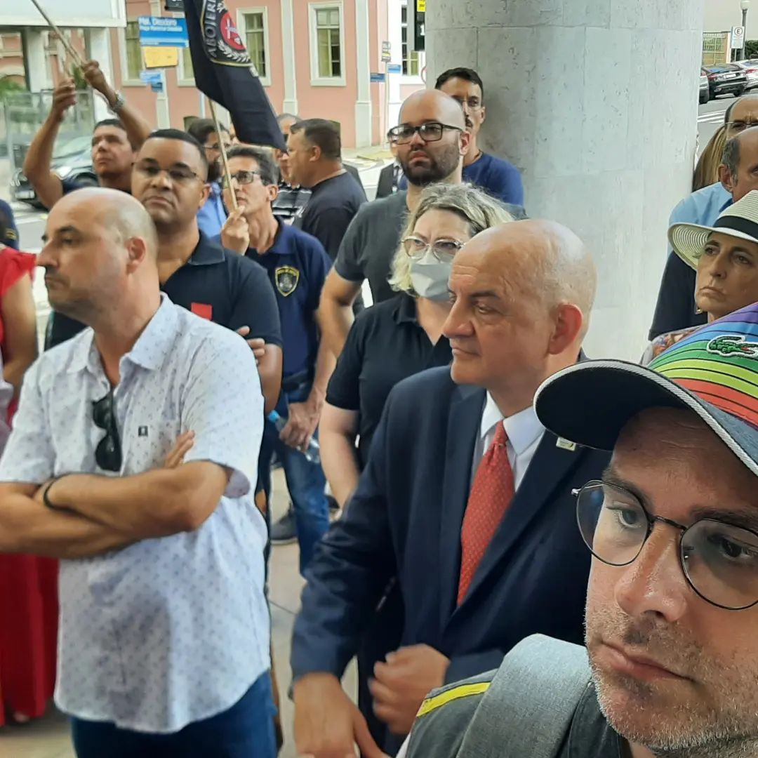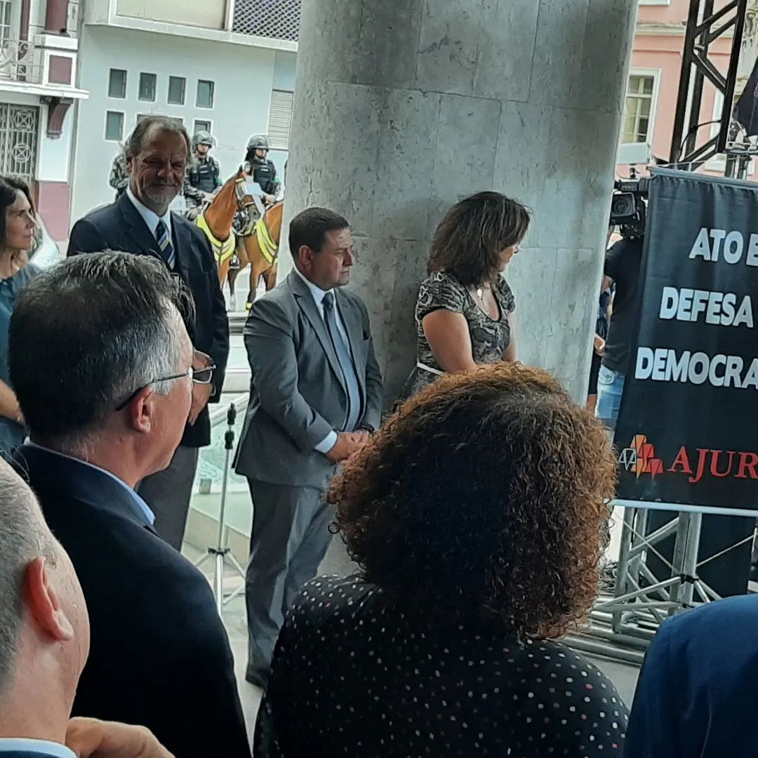O presidente do CEAPE-Sindicato, Filipe Leiria; o diretor jurídico, Hildebrando Pereira e o presidente da Fenastc, Amauri Perusso participaram na última segunda-feira (16/1), do ato em defesa da Democracia, em frente ao Palácio da Justiça, na Praça da Matriz, na Capital. A manifestação reuniu autoridades ligadas ao Judiciário, bem como entidades representativas dos servidores públicos. O ato foi uma convocação da Ajuris, com apoio da União Gaúcha, entidade à qual o CEAPE é vinculado.