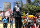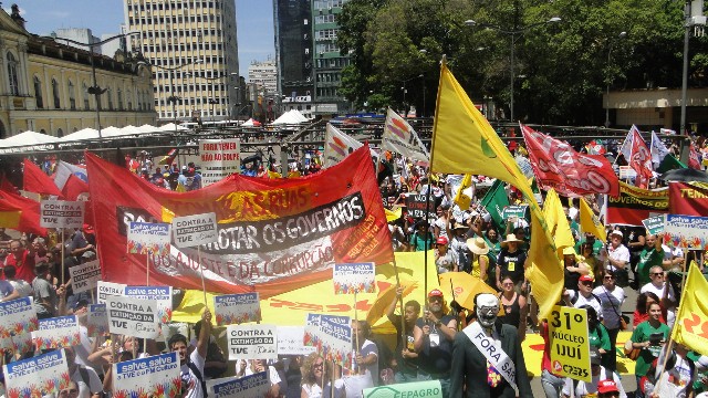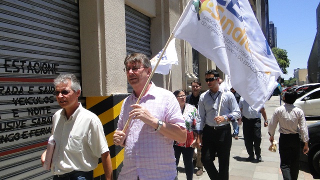 Perto das 14h30min, os servidores saíram em marcha pela Avenida Borges de Medeiros. No caminho, tiveram apoio da população que passava pelo centro da cidade, filmando o ato e se somando aos gritos de “Fora, Sartori” dos servidores. Um boneco representando o governador José Ivo Sartori, com o rosto de uma caveira, mas o bigode e óculos característicos do peemedebista, puxava a marcha.