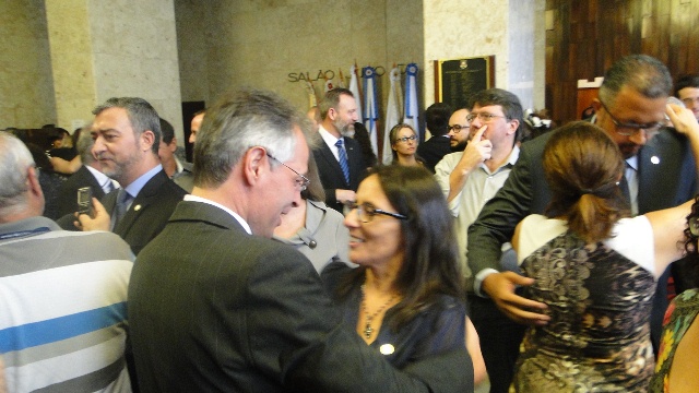 O CEAPE-Sindicato prestigiou nesta quarta-feira, 1/2, a posse dos novos superintendentes e diretores da Assembleia Legislativa do RS para a gestão 2017. O presidente da entidade, Josué Martins, e o vice, Ricardo Silva de Freitas, compareceram ao Salão Júlio de Castilhos, onde ocorreu a cerimônia de posse da primeira mulher a assumir o cargo de superintendente-geral, a ex-coordenadora geral da bancada do PT, Mari Perusso. Os novos diretores foram empossados pelo presidente da Casa, Edegar Pretto, que assumiu o cargo no dia anterior.