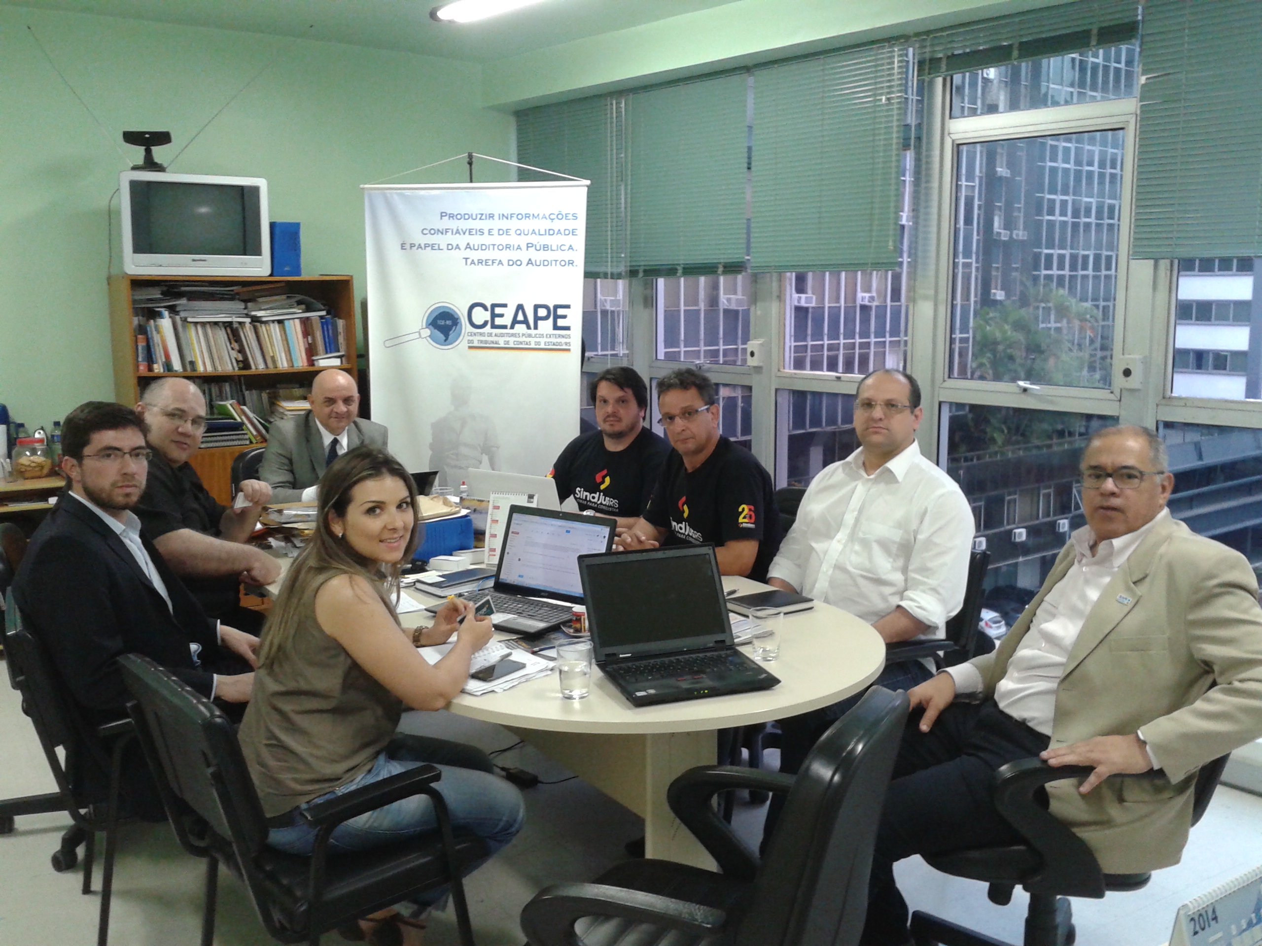 Da esquerda para a direita, Sabrina Fernandes (Diretora Sindical do SINDISPGE), Josué Martins (Presidente CEAPE), Cícero Corrêa Filho (Diretor Sindical do SINDISPGE), Amauri Perusso (Presidente FENASTC), Fabiano Zalazar (Secretário de Imprensa e Divulgação do SINDJUS RS), Roberto Cezimbra (Diretor Sindical SIMPE-RS), Jaime Bezerra (Vice-Presidente CEAPE) e Romano Scapin (Diretor Administrativo CEAPE).