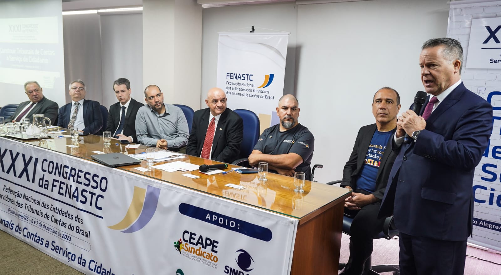 “Construir Tribunais de Contas a Serviço do Brasil” é o tema do XXXI Congresso da Federação Nacional das Entidades dos Servidores dos Tribunais de Contas do Brasil (Fenastc), cuja abertura ocorreu na quarta-feira (6/12), no auditório Moacir Leão, da Afocefe/Sindicato, na Capital. Na oportunidade, o CEAPE-Sindicato foi representado pelo presidente Filipe Leiria, que destacou o momento peculiar da conjuntura brasileira, quando a democracia enfrenta suas crises. O evento contou com representantes de entidades como o TCE-RS, Atricon, Ampcon, Audicon, Conacate Sindtce-rs, entre outros. O encerramento ocorre nesta quinta-feira, com a edição da Carta do XXXI Congresso da Fenastc. Acesse aqui