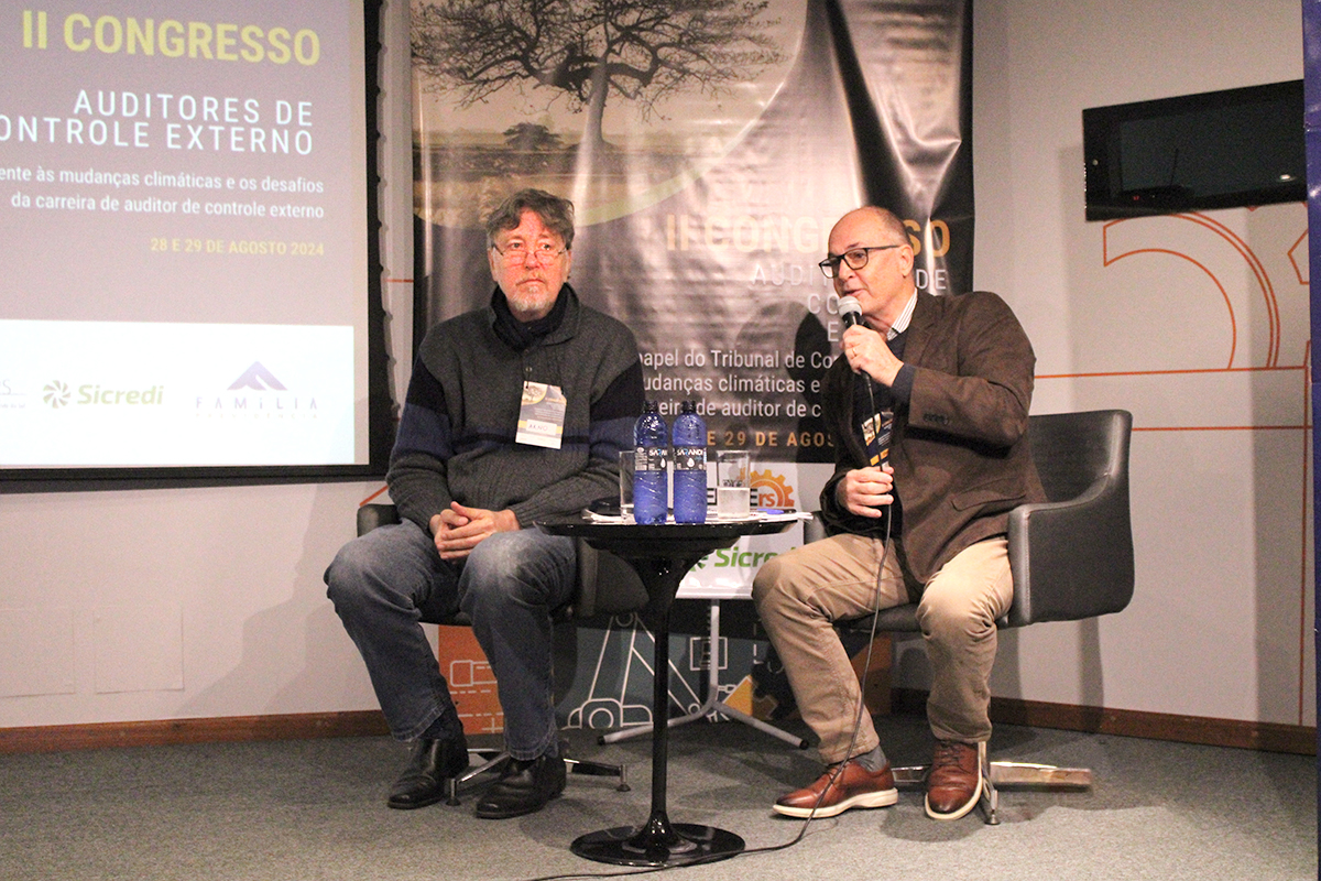 Palestras - Nesse primeiro dia do evento, são palestrantes: Arno Kayser, agrônomo, ecologista e escritor, com o tema Reflexões sobre mudanças climáticas e a tragédia ambiental no RS. Ele destacou a importância dos auditores estudarem o tema e dialogar com a gestão pública para que enfrentem o assunto dentro de uma perspectiva que leve em conta a visão ecológica.