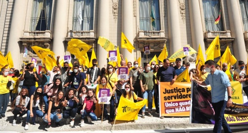 Por volta de 120 servidores vinculados ao Sintergs realizaram manifestação em frente ao Piratini | Foto: Matheus Piccini