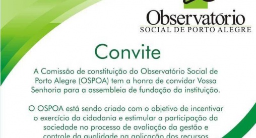Na próxima terça-feira (16/12), às 17h, na sede do Conselho Regional de Contabilidade do RS, (Rua Baronesa do Gravataí, 471 - Menino Deus), será oficialmente criado o Observatório Social de Porto Alegre, com a presença de autoridades municipais, representantes de entidades e sociedade civil em geral.