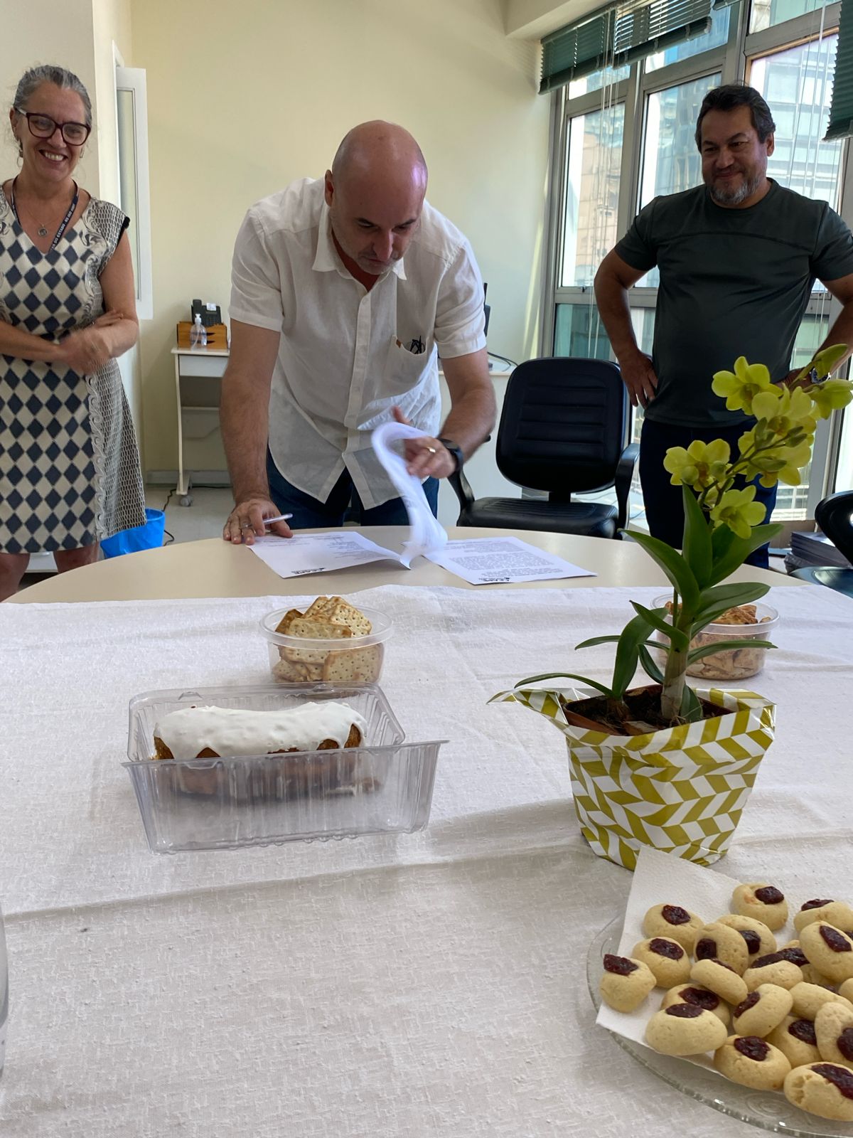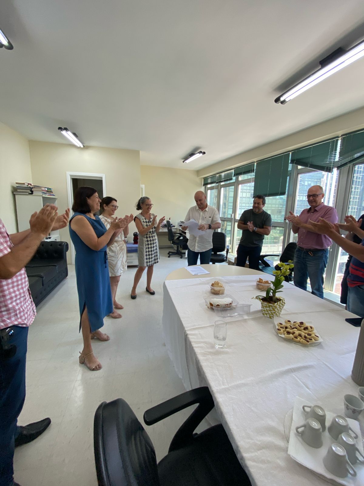 Participaram os seguintes membros (dir. para esq.): Josué Martins (Diretor Integração Social, Cultural e Esportiva); Omar da Silveira Neto (Conselheiro Deliberativo); Julio Perez (Política Sindical, Imprensa e Divulgação); Hildebrando Pereira (Presidente); Angela Menezes Dutra (Vice-presidenta); Renata Balbueno (Diretora Técnica); Naira de Jesus Floriano (Aposentados, Previdência e Saúde) e os membros do conselho Deliberativo Paulo Roberto Assunção e Filipe Leiria.
