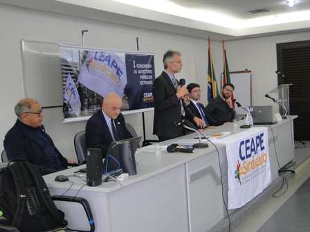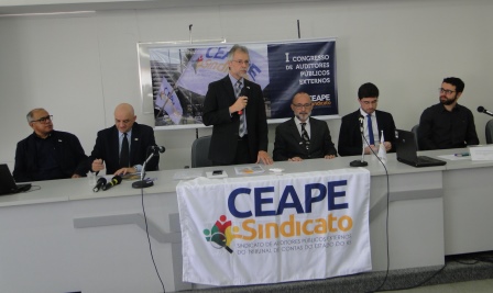Fechando as exposições da manhã, o presidente do CEAPE-Sindicato Josué Martins apresentou as conclusões do último Encontro Técnico sobre a carreira de auditoria, indicando a necessidade de atualizar o Plano de Cargos e Salários, implantando uma verdadeira carreira que contemple progressão funcional e maior efetividade do controle externo mediante um processo de incentivo à constante qualificação do auditor. Defendeu que seja dada efetividade à letra da Constituição Federal, que diz que a nenhum pretexto pode ser negado acesso aos Auditores no desempenho do controle externo, para reforçar a necessidade de compartilhamento do sigilo fiscal das empresas agraciadas com benefícios fiscais.