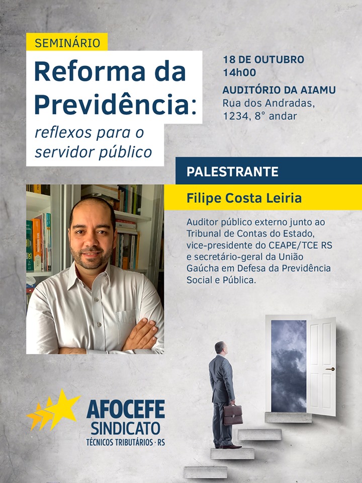 O vice-presidente do CEAPE-Sindicato, Filipe Leiria, é o palestrante do Seminário Reforma da Previdência: Reflexos para o servidor público, promovido pelo Afocefe Sindicato, entidade representativa dos Técnicos Tributários da Receita Estadual. O encontro será no Auditório da Aiamu (Rua dos Andradas, 1234, 8º andar). Participam do debate os desembargadores Aymoré Roque Pottes de Mello e Cláudio Luís Martinewski, presidente da União Gaúcha em Defesa da Previdência Social e Pública.