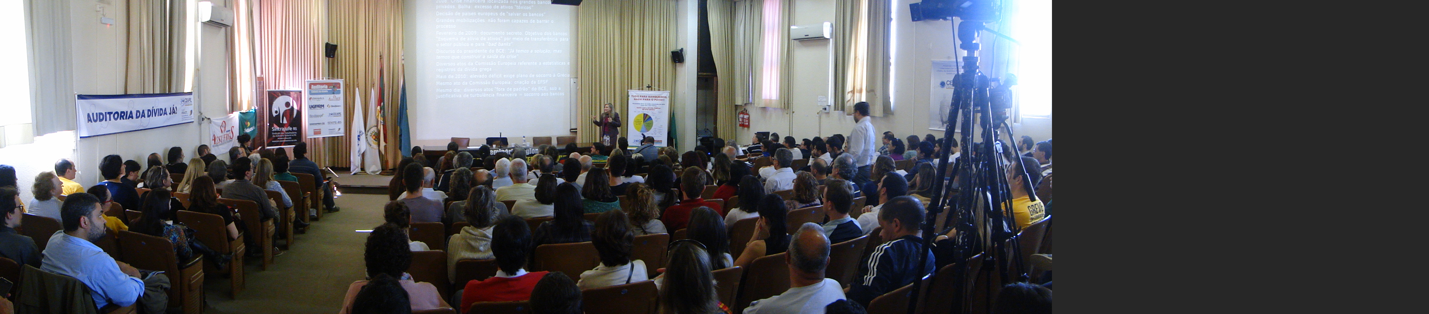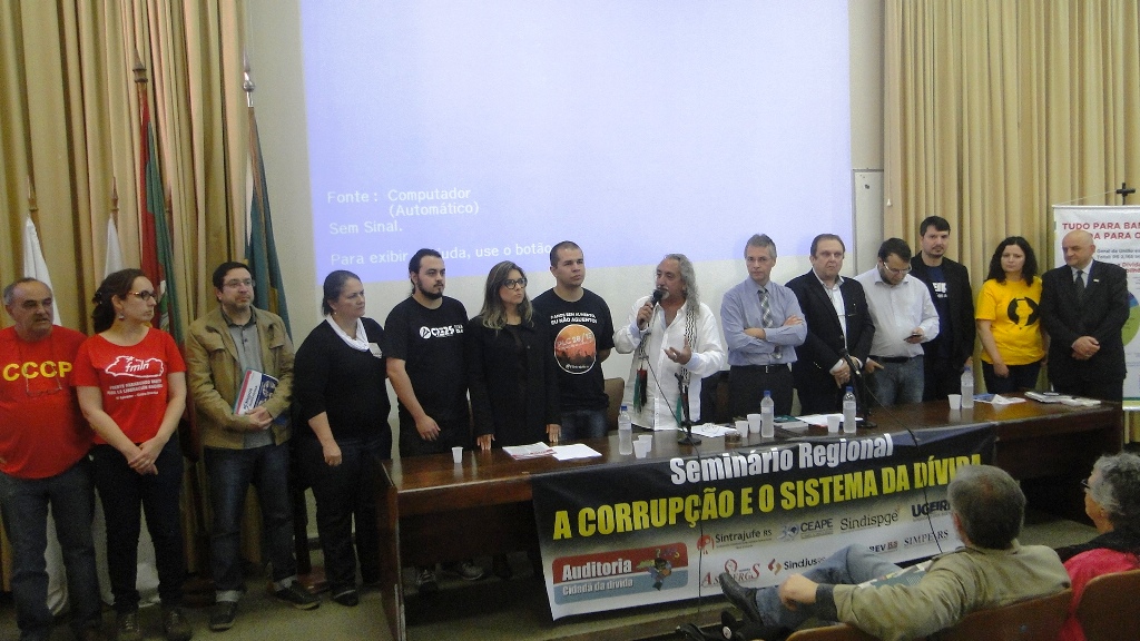 Entender o sistema da dívida, como se comunica do cenário internacional ao local e visualizar saídas foram temas principais no Seminário Regional "A Corrupção e o Sistema da Dívida", promovido pelo Núcleo Gaúcho da Auditoria Cidadã da Dívida Pública. O evento, que aconteceu na quinta-feira, 27 de agosto, no auditório da Faculdade de Economia da UFRGS, em Porto Alegre, contou com a participação da Coordenadora Nacional da Auditoria Cidadã da Dívida Pública, Maria Lúcia Fattorelli, (clique aqui para conferir a participação de Maria Lúcia Fatorelli) e do presidente do CEAPE - Sindicato, Josué Martins (clique aqui e confira a palestra de Josué Martins).