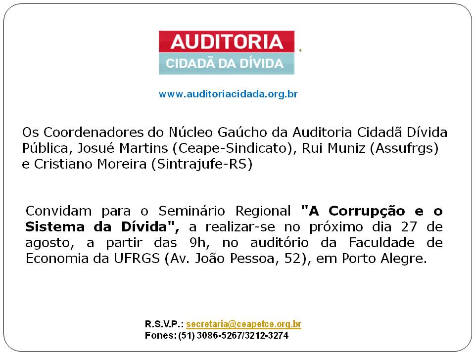 Convidam para o Seminário Regional "A Corrupção e o Sistema da Dívida", a realizar-se no próximo dia 27 de agosto, a partir das 9h, no auditório da Faculdade de Economia da UFRGS (Av. João Pessoa, 52), em Porto Alegre.